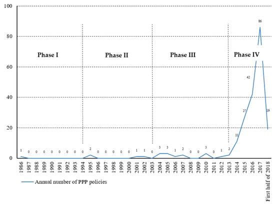 Petersen reviewed studies about PPP policies and regulation aspects and adopted the multiple streams model method to conclude the policy evolution in Denmark and Ireland [28]. However, China is different from Denmark or Ireland because of the socialist market economy system and strong government. A reasonable amount of studies about PPP policy evolution come from the public management and political research area. Willems and Van Dooren pointed out that PPP policies are going to evolve into having a depoliticisation tendency [38]. However, this conclusion is based on the analysis of western democratic countries. Similarly, Mouraviev and Kakabadse put forward a PPP policy paradigm on the basis of policy paradigm theory and Russian practice. Such a paradigm includes ideas, government responsibilities and institutional capacities [39]. Almost all of these studies were established in the western electoral politics context. The particular background of highly centralised China is not the main theme of these studies. Although certain scholars pay attention to China’s PPP policies, a research gap exists in PPP policy evolution, that is, the macroeconomic environment is almost ignored. Chen et al. studied the evolution of China’s PPP-related policies from a sustainable perspective [25]. In another paper, the PPP policy evolution is understood from the policy-learning pattern perspective [40]. Ke et al. reviewed China’s PPP policies between 2014 and 2017 through the content analysis method and pointed out that the application of three policy tools is unbalanced [41]. This article does not provide a complete explanation of this phenomenon, although quantitative analysis of the policy text by coding is a valuable approach. Wang also conducted a similar study [42]. No answer is given for how China’s PPP policies evolve on the macroeconomic aspect and how policymakers adjust these policies facing feedback of the PPP market. Cheng et al. adopted a four-phase division to illustrate the evolution of PPP in China [13]. However, this division was based on the number change of PPP projects, whereas policy documents were not considered in the evolution of PPP. Moreover, the evolution of China’s PPP policies was divided into three phases on the basis of the number change of PPP policy documents through two analysis dimensions (PPP for sustainable development and PPP via a sustainable approach) [25]. Factors of the centralised Chinese government and domestic macroeconomic environment should be considered when dividing the stages of PPP policy evolution.