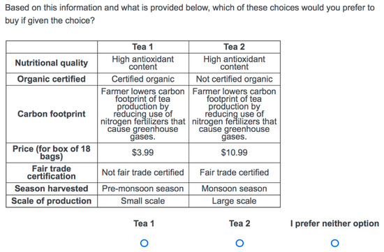A choice experiment was used to elicit consumer preference and willingness to pay (WTP) for brewed green tea attributes. A choice experiment is a stated preference method to quantitatively estimate consumer value for product characteristics [45]. In choice experiments, participants choose between two or more product alternatives that have different combinations of attributes and attribute-levels. For example, an attribute presented in a choice experiment could be whether or not the product was organically grown, and the attribute-levels would be ‘organically grown’ or ‘not organically grown’, thus the attribute would have two levels. Participants choose their most preferred product alternatives in multiple choice sets presented to them in the experiment. Data generated from their choices across multiple choice sets are used to estimate marginal WTP for product attributes. Attributes and levels presented in choice experiments can be real (i.e., available for purchase in a store or market) or hypothetical. Estimating WTP for hypothetical attributes can help predict if consumers would demand such an attribute if it was to become available in the market.
