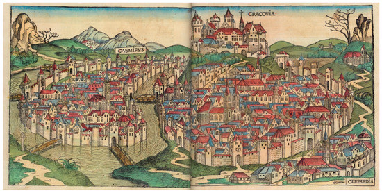 Colored woodcut town view of Krakow (1493) [29]. Public domain.