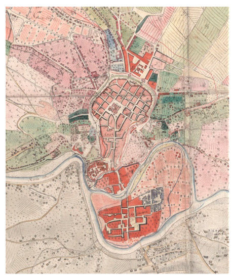 The naturally defensible character of the area was not enough for a timber and otherwise unfortified town to resist the Mongol invasions in the middle of the thirteenth century. Krakow burned down twice during this period. In 1257, between the first and the second invasion, King Bolesław the Chaste signed Krakow’s town charter: deprived of any graphical appendices, the document featured a description of the new town’s parcellation strategy that was based on the so-called Magdeburg law. The largest market square of Medieval Europe was delineated, along with a grid of streets and urban blocks further divided into plots. The new plan was adapted to existing elements, hence local departures from its rigid geometry, facilitating the uniqueness of the entire layout that has survived to this day. A similar principle was adopted during the founding of two additional towns that co-created Krakow’s Medieval agglomeration: the larger and richer Kazimierz (Casimirus) to the south (1333) and the smaller, more modest and unfortified Kleparz (Clepardia) to the north (1366), as well as the suburb of Stradom (Figure 1; Figure 2).