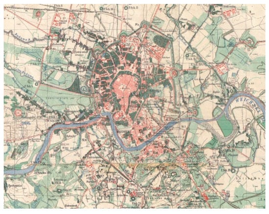 Periods of relative prosperity interweaved with political crisis during subsequent centuries. The latter were largely the deciding factors in the preservation of the town charter-period Medieval urban layout. There are neither Baroque axes, nor monumental Enlightenment-era districts in Krakow. Not even nineteenth-century burgher districts exist. A sort of a substitute of the latter are the so-called Planty Dietlowskie, built in the years 1878–1880 in the place of the buried former riverbed of the Old Vistula (Figure 2; Figure 3)—essentially a street that only echoes metropolitan boulevards.