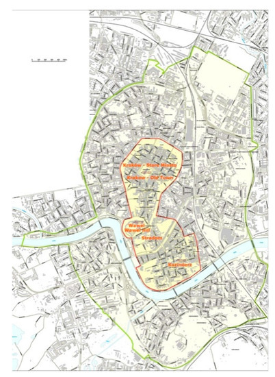 The legal basis for the protection of the Old Town along with Wawel Hill, Stradom and Kazimierz (Figure 4) as a UNESCO World Heritage Site is the Convention of 1972, ratified by Poland in 1976 [38]. Section 97 of the Convention’s operational guidelines states that “all properties inscribed on the World Heritage List must have adequate long-term legislative, regulatory, institutional and/or traditional protection and management to ensure their safeguarding. This protection should include adequately delineated boundaries”. The 1985 Convention for the Protection of the Architectural Heritage of Europe [39] requires its signatories to, among other things, appropriately supervise and enact regulations for the issuing of decisions and to create an integrating heritage conservation policy.