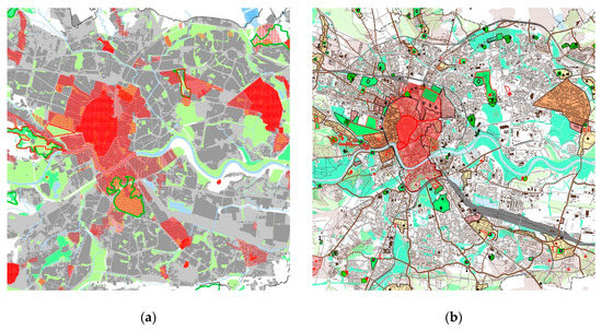 Cultural heritage protection areas: (a) 2003 Study for spatial development; dark grey—built areas; bright grey—areas for development; solid red—areas with integrated and prevailing cultural heritage; mid red hatch—areas with cultural heritage requiring integration; bright red hatch—areas with cultural heritage requiring revalorisation [51]; (b) 2014 Study for spatial development; areas under legal protection: black perimeter—historical city structure considered the monument of history; red perimeter—registered monuments; registered historical urban layouts: mid red hatch—areas with cultural heritage requiring integration; intensive red hatch—Wawel and Stare Miasto (the area of Cultural Park), mid red hatch—Kleparz, Wesoła, Kazimierz and Stradom (parts of medieval agglomeration and historical suburbs); bright red hatch—Podgórze (Austrian city charted in 1793, situated on the southern river bank). Neither the area of the UNESCO world heritage site of universal value, nor its buffer zone are marked [47].