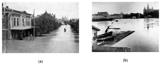Throughout its history, Krakow has survived many severe floods. These were primarily fluvial floods that did not display a tendency for regularity, although they were quite numerous. One of the largest and the first well-documented one was the great flood of 1813. Since the beginning of the 20th century, the largest and most catastrophic floods, both in terms of territorial range and hydrological significance, occurred in 1903, 1925, 1934, 1970, 1997, 2001, 2004, and 2010 [Table 1] [5,53,54,55]. Photographic documentation making it possible to assess the scale of the destruction has survived (Figure 6).