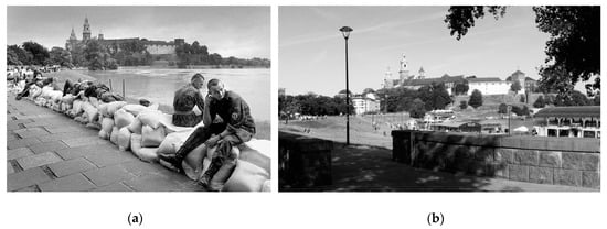 Temporary and permanent safety measures at the Vistula River boulevards near the Royal Castle on Wawel Hill and the Dębnicki Bridge: (a) Increasing the height of the boulevards by laying sandbags during the flood of 1997 (photo by Maciej Zienkiewicz, Agencja Gazeta); and, (b) The floodwall built in 2003 with the possibility of installing an additional demountable wall (photo by Izabela Godyń, 30 June 2019).
