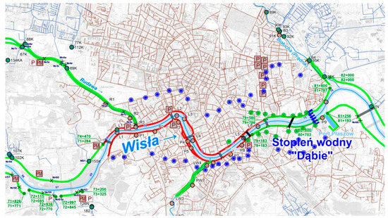 The Vistula River’s barrages are an additional threat. They are composed of six damming barrages that were built in the years 1949–2002, of which three are located within the city limits. Under normal conditions they stabilise the water level within the city, but in the case of a flood, they increase flood risk due to the additional damming of significant water surges [61]. This particularly applies to the barrages located within the city limits. Furthermore, the barrage structures, in particular the construction of the Dąbie barrage, has led to a rise in the groundwater table in inner-city areas adjacent to the Vistula, along its section from the mouth of the Rudawa River to the Dąbie barrage, which feature historical buildings and complexes, as well as a significant part of the area placed on the UNESCO World Heritage Site List and its buffer zone. A draining barrier was designed, featuring 37 drainage wells, which are placed on both sides of the Vistula in order to maintain a safe water table level (Figure 9). Water is pumped from the wells to a combined sewer network or directly to the Vistula and its tributaries (the Wilga and the Rudawa) [60], however, rivers are incapable of receiving water during a flood. This is a significant factor that increases the flood hazard in the features of the construction of the structures and the densification of development in the city centre. Any interference with the existing geological system disrupts hydrogeological conditions and it can cause a local, groundwater-based increase in flood risk when combined with heavy rain, which seems underestimated in the case of many of the new investments that have foundations going as deep as a dozen meters below ground level.