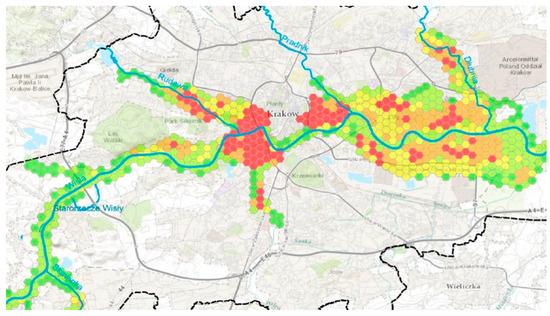 Spatial distribution of flood risk within the Hot Spot Krakow zone. Five risk levels with an associated colour code have been presented: dark green—very low risk, green—low risk, yellow—moderate risk, orange—high risk, red—very high risk [70].