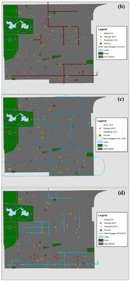 Mapping safe passage routes and gun-related crimes in East Garfield: (a) 2012, (b) 2013, (c) 2014, (d) 2015), (e) 2016, and (f) 2017.