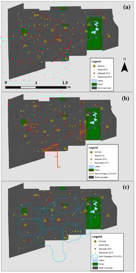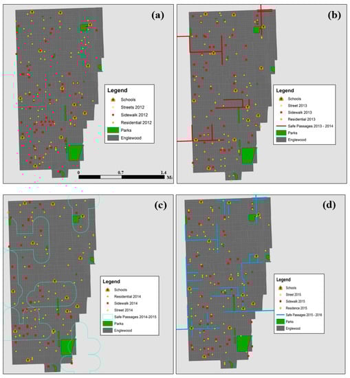 Table 1 shows the number of the safe passage routes in the four community areas from 2013 to 2017, as extracted from the raw data of the Chicago safe passage routes collected from the Chicago Data portal website [23]. As shown in Table 1, the numbers of safe passage routes have been slightly expanded over the past several years.