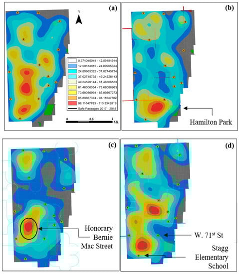 As shown in Figure 9, Austin has seen a noticeable change in aggravated handgun assault incidents from 2012 to 2017. The year 2012 was characterized by an intense, yet sporadic clustering of crimes; however, the pattern of gun-related crimes has shifted since the establishment of the safe passage routes. With the exceptions of 2014 and 2015 (Figure 9c,d), the number of crimes has decreased near the routes; however, high values have remained steady in the areas surrounding W Madison St., W Jackson Blvd, and W Washington Blvd (in the blue box in Figure 1).