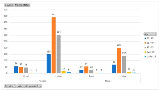 Out of 1613 validated answers, 1074 belonged to women and 539 to men. Most persons (1342) lived in an urban area, while only 271 reported living in rural locations. Their distribution depending on age, gender, and living environment is presented in