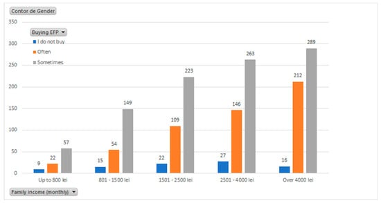 20]. However, the answers provided do no cover this hypothesis. Thus, paradoxically, low- and medium-income families buy ecological agroalimentary products sometimes and even frequently. Under these categories of income there are few families that do not buy ecological agroalimentary products as shown in