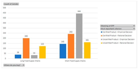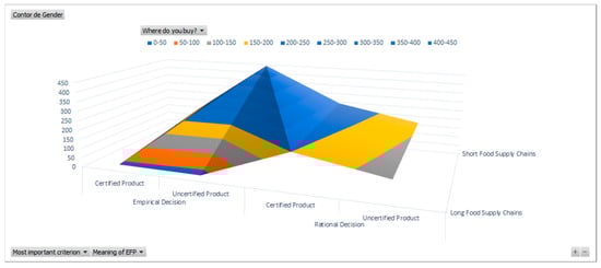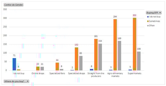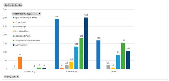 Figure 6, most respondents state that they buy ecological agroalimentary products from the farmers’ market, supermarket, or directly from the producers, which is highly relevant to our further analysis.
