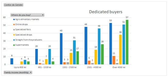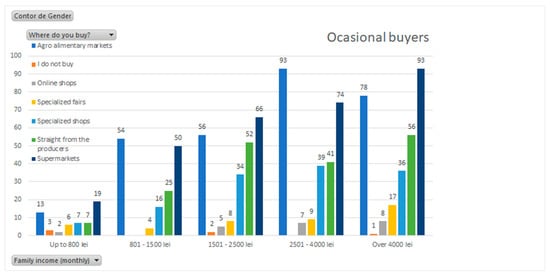 Additionally, if we are to correlate these data with the incomes of those who buy on a frequent basis (33.7% of the respondents), we can notice that in the case of low and medium incomes, the supermarket is by far exceeded by the agroalimentary farmers’ market as a purchase location (