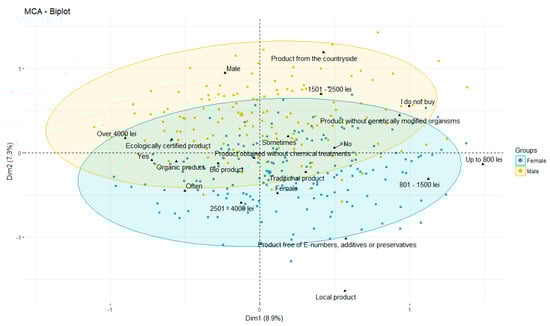 Figure 9, where the similarities and dissimilarities are presented through a multivariable analysis of the correlations among the following categories of data: family monthly income, what is an ecological agroalimentary product as understood by the respondents, gender, and frequency of purchase.