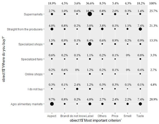 Among the occasional buyers (60.8% of the respondents), the ponderosities of the agroalimentary farmers’ market and supermarket—as places of purchase—were close. It is possible that they were precisely the consumers who were fully aware of the great differences between the ecological products as certified products and other products (see