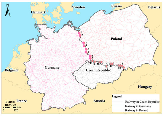 Continuous process of unification and integration of the railway markets of the European Union countries, both in terms of legal requirements and the application of similar organizational and technical solutions, makes railway cross-border transport a significant and constantly growing share in this market [7,8,9,10]. Poland is an example of a country where this type of railway traffic (in the area of passenger and freight transport) is systematically becoming an increasingly important area of activity of railway undertakings and infrastructure managers [11,12,13,14,15]. The biggest area of activity of freight railway undertakings in this regard is to conduct border transport processes. This type of transport consists of carrying out the transport of goods in one country, crossing the border and performing manoeuvring operations at the border station. This article describes this type of transport and the main problems connected with it on the example of Poland and two neighbouring countries—the Federal Republic of Germany and the Czech Republic.