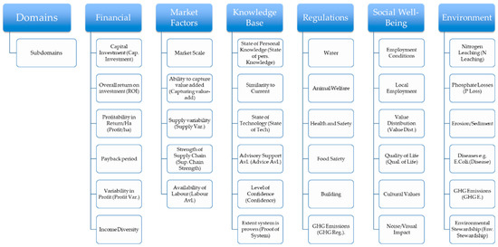 A crucial component of applying MCDM and the AHP is identification of the criteria to be used to evaluate alternative systems [20,30]. A practical challenge with developing indicators within an AHP framework is to have a sufficient number to be comprehensive (i.e., able to capture the key elements of the decision-making process) but also few enough to make the process manageable in an applied situation. This challenge emerges because the need to undertake pairwise comparisons means that as the number of criteria increases so the number of comparisons that the land manager has to make also increases. In earlier work [26], the criteria were identified (and refined) through a process involving review of the literature (including [30,40,41]), scientific opinion and verification with those involved in land management. From this process, a number of criteria emerged which were classified into six key domains: financial; market; environment; social well-being; regulation and; knowledge base (Figure 1).