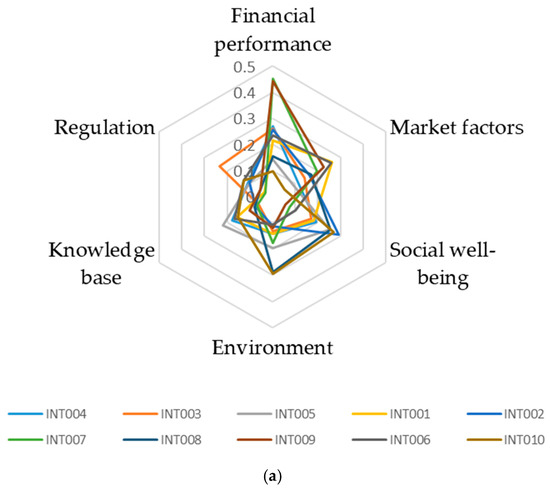 Spider diagrams of individual subdomain weightings by participants. (a) Financial Performance (b) Market (c) Regulation (d) Environment (e) Social Wellbeing (f) Knowledge Base.