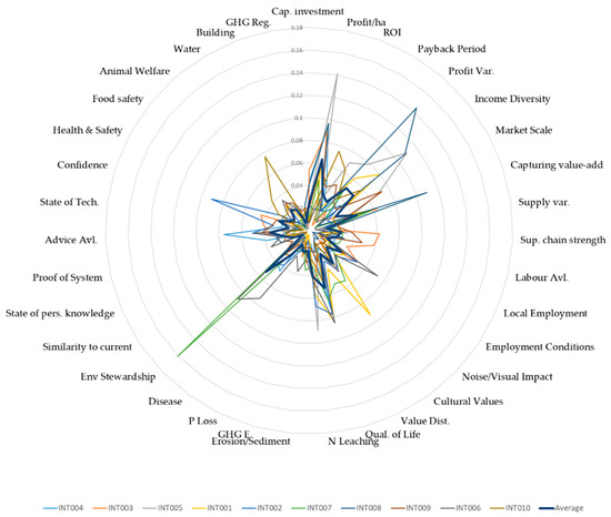 The diversity in the weights generated at the domain level is also reflected at the individual subdomain level (Figure 3). Whilst for some respondents there is a clear criterion that dominates (such as environmental stewardship for INT007 and ROI for INT005) the weights are still relatively low at 0.15 (15 percent) or less. The subdomain results provide finer detail of the decision-making process and highlight that even if through the pairwise comparison at the domain level landowners may have given similar weights to a particular domain, they can differ considerably in terms of the importance they place on particular criteria within that domain.