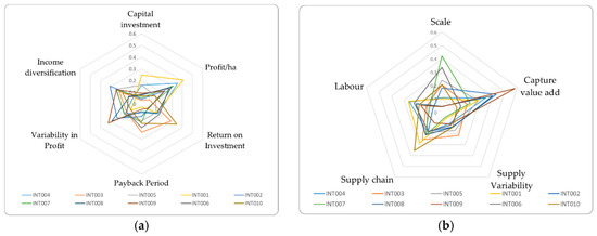 As noted, differences in the weights of the criteria in the subdomains shown in Figure 3 are in part driven by the weights given to the overall domain. Figure 4, however, presents the weights generated for the individual criteria within the subdomains in their own right and shows a different perspective as to how the criteria are viewed by land managers. For example, within the financial domain (Figure 4a), either profit per hectare or return on investment were usually highly weighted, whilst the capital investment required or the length of the pay-back period were less important. In the other domains, other key criteria emerge, for example: the ability to capture value and scale of the market (Figure 4b); water quality and animal welfare (Figure 4c); nitrate leaching and environmental stewardship (Figure 4d); quality of life, cultural values and conditions of employment (Figure 4e) and; availability of advisory support (Figure 4f).