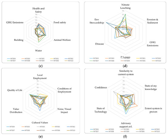 Within the knowledge domain, Figure 4g highlights that farmers are willing to consider systems that are outside of their current sphere of knowledge. This is highlighted by the low weights generated for the importance of the system being similar to their current system and also their own level of knowledge about the new system. In contrast, the availability of advisory support was highlighted as being important by a number of participants, although they felt that this would be generally be available if they needed it.