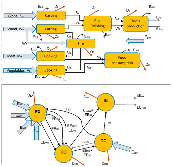 25], clan and tribe activities are divided into four sectors: extraction, conversion, industrial, and domestic. In the EEA theory, there are three more sectors, clearly not applicable to the HS/HN societies: agricultural (AG), tertiary (TE), and transportation (TR). These somewhat overstated denominations refer to the collection of stone, wood, meat and vegetables (EX), to their preparation (CO), consumption (DO) and final use (IN), respectively. It is apparent that the physical model is at a much more disaggregated level than EEA: this is necessary though, because the exergy budget of the set of the individual sectors is described in terms of the individual fluxes of material and energy they exchange. EEA introduces three additional exergy fluxes (L