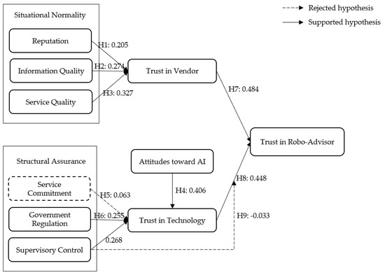 Customer’s behavior can be strongly influenced by service quality [80]. For customers, positive service quality generally results in a favorable behavior, such as trust, adoption and continuous usage [81,82,83]. In an internet environment, where the companies’ competition is getting more severe than before, service quality is a critical factor in choosing a product or service. For example, service quality positively affects trust and further facilitates the relationship commitment between customers and IT service [84]. In other e-commerce products such as e-government and online shopping, the role of service quality is also significant [66,85]. Based on the trust transfer theory, we argue that superior service quality might facilitate commitment to the robo-advisor vendor, finally leading to the trust in robo-advisors. Thus, we hypothesize: