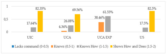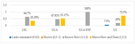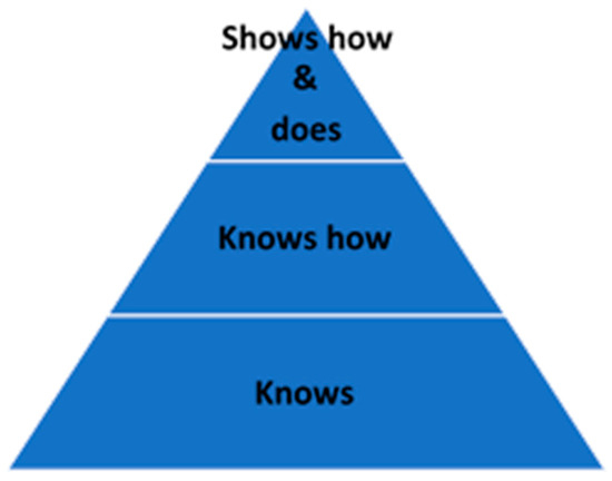 Miller established four skill acquisition levels defined by learning outcomes (indicators) based on the standards established for the National Centre for Education Statistics in the United States [39]. In this research, the version of the EDINSOST project in which the two higher levels of competencies are put together was used. The first level (KNOWS) at the base of the pyramid corresponds to knowledge and refers to learning, the second level (KNOWS HOW) corresponds to integration and development in a situation, and the third level (SHOWS HOW & DOES) is related to showing competency during action and the possibility of transferring that action.
