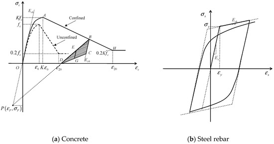 The modified Kent-Park concrete constitutive model as shown in Figure 1a is adopted to mimic the material behaviors of the unconfined and confined concrete. The envelop curve of this model is initially proposed by Kent and Park [35] as extended by Scott et al. [36], then extended again by Yassin [37] for cyclic loading and taken into account the concrete damage and hysteresis. In the figure, fc is the concrete compressive strength in MPa, K is a factor which accounts for the strength increase due confinement, Ec0 is the initial tangent modulus, ε0 is the concrete strain at maximum stress, ε20′ and ε20 are unconfined and confined concrete strain at 20% of maximum stress, respectively. The point P is used to define the degradation of stiffness that the projections of all reloading lines intersect at that common point. This concrete material has degraded linear unloading/reloading stiffness and no tensile strength. Detailed formulas and rules governing envelop (O→A→B→H branch) and unloading/reloading behaviors (B→C→D→E→G branch) are based on the study by Yassin [37] (Equations (2.22)–(2.40) in the reference).