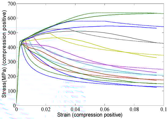 Comparison between the numerical results and test results by Monti and Nuti [42] (Specimen slenderness ratio L/d = 1. Dot line: numerical results; Solid line: test results).