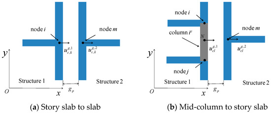 The compression deformation of the Hertz-damp model needs to be calculated firstly and then calculation of the pounding force. There are two typical pounding situations between adjacent frame structures as shown in Figure 6, including (1) When the heights corresponding to story slabs of the two adjacent structures at which pounding occurs are same, pounding will be between the beam-column joint to joint (i.e., the pounding occurs at the level of story slab to slab. See Figure 6a); (2) Otherwise, the pounding may occur between the story slab and a point within the column (i.e., story slab to mid-column. See Figure 6b). In the finite element model to simulate the first situation, the pounding occurs between two elemental nodes; and for the second situation, the pounding may occur between two elemental nodes or between the elemental node and the mid-element.