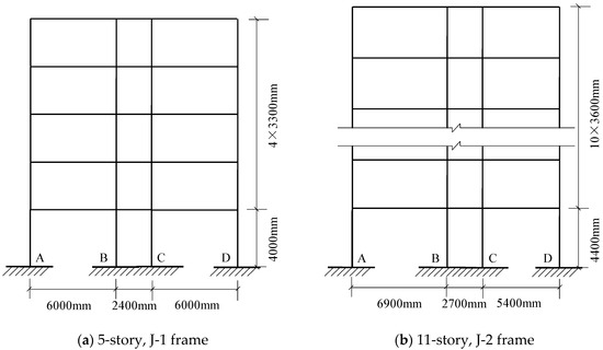 Two RC frames with 5 stories (J-1 frame) and 11 stories (J-2 frame) are modeled to illustrate the collision analysis and discuss on the rational seismic separation gap. The two frames are with regular configuration, as shown in Figure 7. The fundamental periods are 1.11 s and 2.23 s for the 5-story frame and 11-story frame, respectively. For detail information of these RC frames, such as cross-section dimensions of beams and columns, and materials of concrete and steel rebars, are provided in Table 1, Table 2 and Table 3 shows a total of 24 records of horizontal components of ground motion records selected for the pounding analyses and determination of the rational separation gap between the two frame structures. These ground motion records are recommended by the standard of general rule for performance-based seismic design of buildings [48].