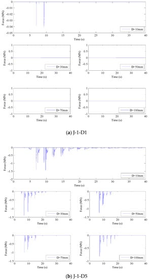 Figure 9 shows the pounding forces at positions of J-1-D1 (1st story in axis D in J-1 RC frame) and J-1-D5 (5th story in axis D in J-1 RC frame). The figure illustrates that the pounding force and pounding frequency generally increase as the separation gap decreases. The pounding force and pounding frequency of upper stories (e.g., 5th story) are more serious than those of lower stories (e.g., 1st story). Figure 10 shows the horizontal acceleration and displacement responses at positions of J-1-D1 and J-1-D5. It seems that the pounding increases acceleration and displacement responses in most cases. The final states of beam and column damage indices are shown in Figure 11.
