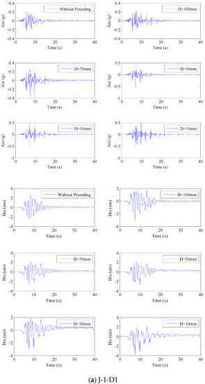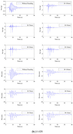 Horizontal accelerations and displacements at the 1st and 5th stories in axis D in J-1 RC frame under ground motion (El Centro, Array #5, 140). The separation gaps between two frames are D = 10 mm, 30 mm, 50 mm,70 mm, and 100 mm.