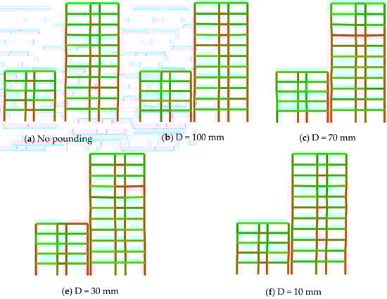 The Equation (27) can be seen as external nodal loads on the structures, which can be integrated into the system dynamic equilibrium equations of motion of the two adjacent structures. Newmark implicit numerical integration method is used with a default incremental time step of 5 × 10−3 s. The time step can be automatically interpolated into a small value by checking whether the pounding occurs.