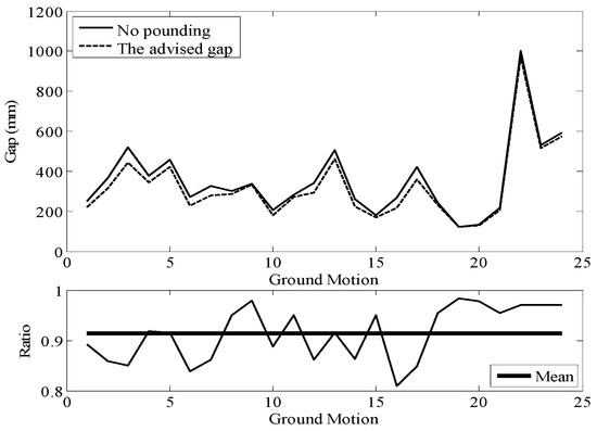 Figure 12 shows the structural damage index varied with the separation gap between the two RC frames. The figure illustrates the structural damage index is not linearly relevant to the separation gap. However, it seems that the structural damage will become to a constant value, i.e., it does not increase to larger values, when the separation gap is larger than a threshold value. In addition, the threshold value can use a value smaller than the required separation gap so no pounding occurs (see the damage index variation between the line for advised gap and line for no pounding in Figure 12). In this study, the advised threshold value is set as the separation gap, which after it the variation of the structural damage index is no larger than 2% of the maximum structural damage index. Follow this definition of a threshold value, more spaces between two adjacent structures can be saved to create additional economic profits in practical engineering projects. The 24 ground motion records in Table 3 are used to calculate the advised separation gap and required separation gap with no pounding. Figure 13 shows the calculated results and the mean ratio of the advised separation gap and the required separation gap with no pounding is about 0.9. In general, if the separation gap is set as 500 mm, there are over 85% probabilities that the damages are no more than that the damage without pounding.