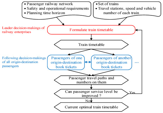 The DOTTP involves the decision-making of both rail enterprises and passengers, and the way they influence each other is shown in Figure 1. First, rail enterprises formulate a timetable with a set of trains based on a given rail network and many safety and operation restrictions, which is regarded as leader decision-making. Then, passengers have to book tickets of one or more specific trains to travel from origins to destinations based on this formulated train timetable, which involves multiple follow-up decisions. Passengers’ follow-up decisions can be viewed as feedback to the leader decisions of rail enterprises. Generally, it is very effective for rail enterprises to improve their previous formulated train timetable, i.e., leader decisions, according to the feedback. Accordingly, that adjustment of the leader decisions will further lead to the changes to passengers’ follow-up decisions. In reality, the alternate adjustment of the leader and following decisions may last for a long time until passenger service level cannot be improved further, but it also may be terminated for some reason, for example, the constant change of demands. The leader–follower hierarchical relationship of decision-making between railway enterprises and passengers can be described as a bi-level programming model, consisting of an upper-level model for train timetabling detailed in Section 3.1 and a lower-level model for distributing passengers to trains, as introduced in Section 3.2.