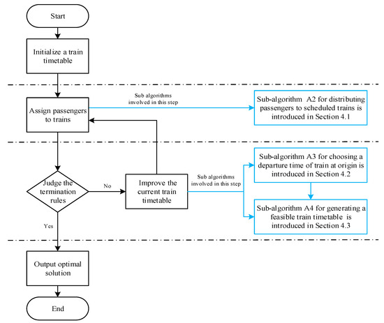 In the above Algorithm (A1), the initial train timetable obtained may not be feasible because train arrival and departure times may not satisfy the safety interval constraints, which are not considered. However, the improved train timetable obtained by the Sub-Algorithm (A4) must be feasible.