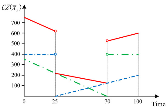 - The time-dependent demand of each origin–destination is discretized into many granularity-based demands through dividing the planning horizon into multiple time granularities with a length of 10 min or another required time interval, and the planned departure time of each granularity-based demand is the middle time of its corresponding time period. For example, demands of granularity from 8:00 to 8:10 have the same planned departure time of 8:05.