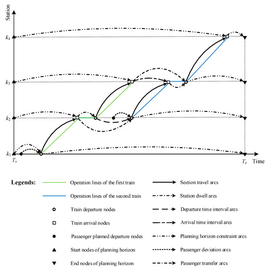 In the above LM, the objective in Equation (9) is to minimize the total generalized cost for passengers, which consists of three parts. The first part represents the cost on trains including in-vehicle time, ticket price, and discomfort penalty; the second part expresses the deviation time between the train’s departure time and passengers’ planned departure time at origin; and the third part is the transfer time at transfer stations respectively.