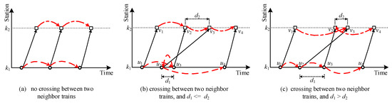 Equation (12) gives the calculation method of the total number of passengers on trainfrom stationto station, Equation (13) determines the number of passengers of time period boarding trainat origin, and Equation (14) gives the calculation approach of the total number of passengers transferring from trainto trainat station.