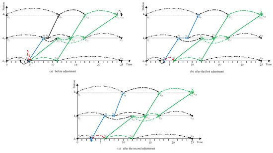 Generally, the departure time of a train at origin has a great influence on passengers’ deviation time and transferring time, but little effect on passengers’ in-vehicle time as a train’s travel time is usually only allowed to vary within a small range. For simplicity, we first determine the departure time of the train at origin with the objective of minimizing the total deviation and transferring times of its distributed passengers, and then calculate its arrival and departure times at other visited stations. Therefore, we first have to calculate the deviation and transferring times of passengers traveling partially or wholly with the current scheduling train before detailing the algorithm. The following two notes should be emphasized when calculating them.