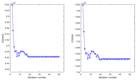 Figure 12 demonstrates that, with the continuous increase of the iteration number, the objective function value UO and LO decrease rapidly at first, and then decrease slowly until the algorithm converges smoothly. In the convergence process of UO, the number of iterations needed for the algorithm to reach convergence is about 50, but, in fact, the convergence solution was obtained in 20 iterations. It indicates that our proposed algorithm performs well in convergence.