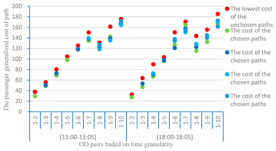 Figure 13 shows that the passengers of each OD-pair can choose at least one path to travel, and the generalized travel cost on their chosen paths are almost equivalent with each other. Furthermore, for every OD-pair, the generalized travel cost on chosen paths (green dots, dark blue dots, light blue dots, and cyan dots) are all less than the minimum among other unchosen paths (red dots). Therefore, it proves that the passenger assignment has achieved an equilibrium. For example, doe OD 1–8 in time period 13:00–13:05, the total number of passengers corresponding to this OD is 20, and they are assigned to four different paths with the number of passengers being 5, 5, 3 and 7, respectively. The relevant generalized travel cost on these four paths are accordingly 125.65, 121.00, 118.60 and 127.25. It is obvious that the difference among them are limited in a small range, and all of them are no more than the minimum among other paths not chosen by passengers of this OD-pair.