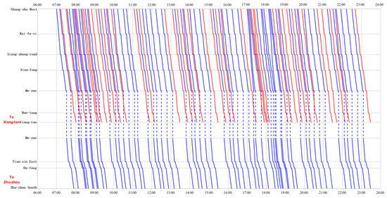 The full-day train diagram of Changsha–Zhuzhou–Xiangtan Intercity Railway obtained by our algorithm.