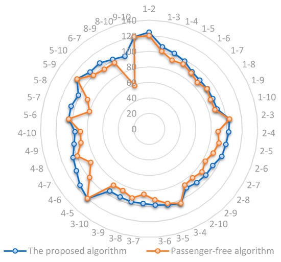 Based on the results shown in Figure 15, the average travel speed of each OD passenger flow in our algorithm is significantly faster than that in passenger-free algorithm. Specifically, in our algorithm, the average travel speed is 104.35 km/h, while it is 93.57 km/h in the passenger-free algorithm. Moreover, the percent of OD pairs whose average travel speed exceeds 100 km/h is 53.85% in our algorithm compared with only 20.51% in passenger-free algorithm. Thus, the train schedule obtained by our algorithm can give passengers a much faster travel speed, which improves the travel efficiency of passengers in urban region and ensures the timeliness of travel.