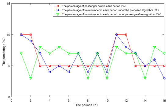 To analyze the matching degree between train capacity and passenger flow in different periods, their matching curves are presented in Figure 16. Due to the huge number of granularity-based demands, we integrate data in units of 1 h. The red line denotes the percentage of passenger flow in each period, while the blue and green lines represent the percentage of train number in each period optimized by our proposed algorithm and passenger-free algorithm, respectively. According to the changing trend of three lines, we can draw the conclusion that the changing trend of train number is more consistent with passenger travel demand in our algorithm, while there is no obvious matching relationship in passenger-free algorithm.