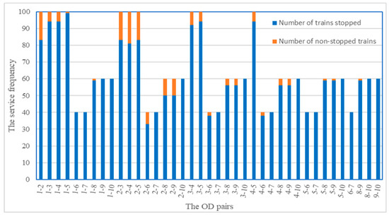 A satisfactory train schedule should not only minimize the total travel time and travel cost of passengers, but also optimize the service frequency between OD pairs along the railway line. In the process of optimizing the arrival and departure times at stations of trains, our algorithm also takes the optimization of train stops into consideration. On the train schedule obtained by our algorithm, the service frequency of each OD pair of CZT Intercity Railway is shown in Figure 17. As shown in Figure 16, the service frequency of each OD pair effectively match with its travel demand, so that trains’ total travel time is cut down, and the satisfaction of passengers is improved greatly.