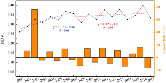 The changing trend in the annual mean NDVI of the East Dongting Lake wetland during the wintering seasons between 2000 and 2018.